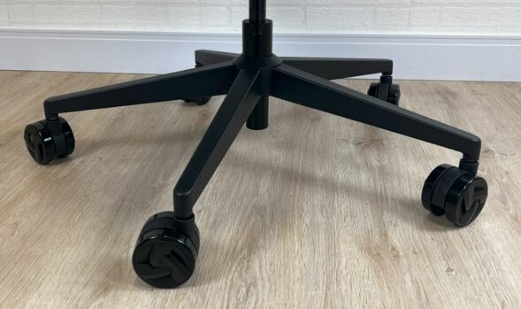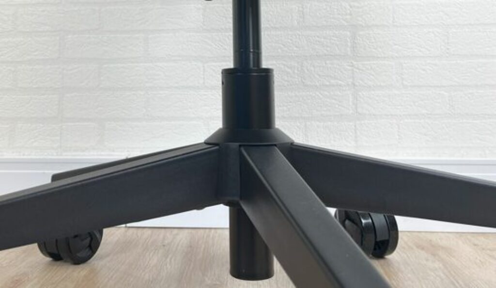 A base da Core Smart é em aço, com os 5 pés separados para montagem no miolo central da estrutura (forma de conseguir diminuir o tamanho necessário de cada caixa e colocar mais cadeiras dentro do mesmo espaço no container – barateando a questão da logística), com uma boa qualidade de construção.