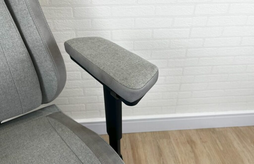 A chapa dos braços são acolchoados e os acabamentos laterais dos braços são de boa qualidade em geral. Aqui possui o pino lateral de bloqueio, para evitar mudanças com simples esbarros.
